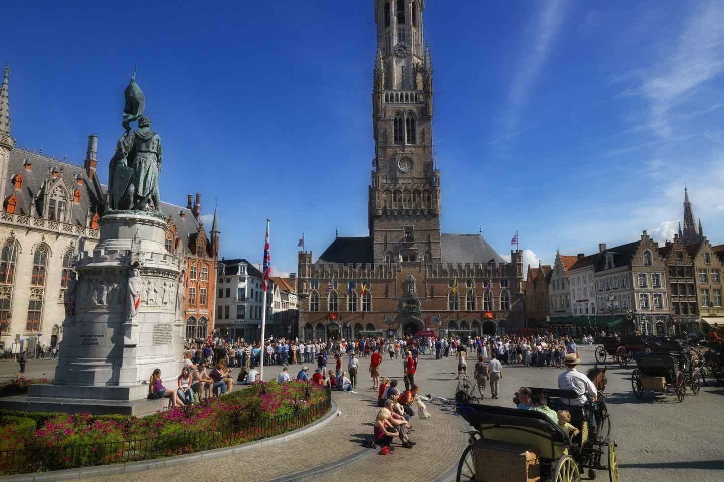 Stroll along the vibrant main shopping street toward the iconic Market Square, pausing to admire the impressive St. Savior Cathedral. The route leads you to the bustling Market Place, where the striking 83-meter belfry towers above, and to Jan Van Eyck Square, once the thriving commercial hub of medieval Bruges.