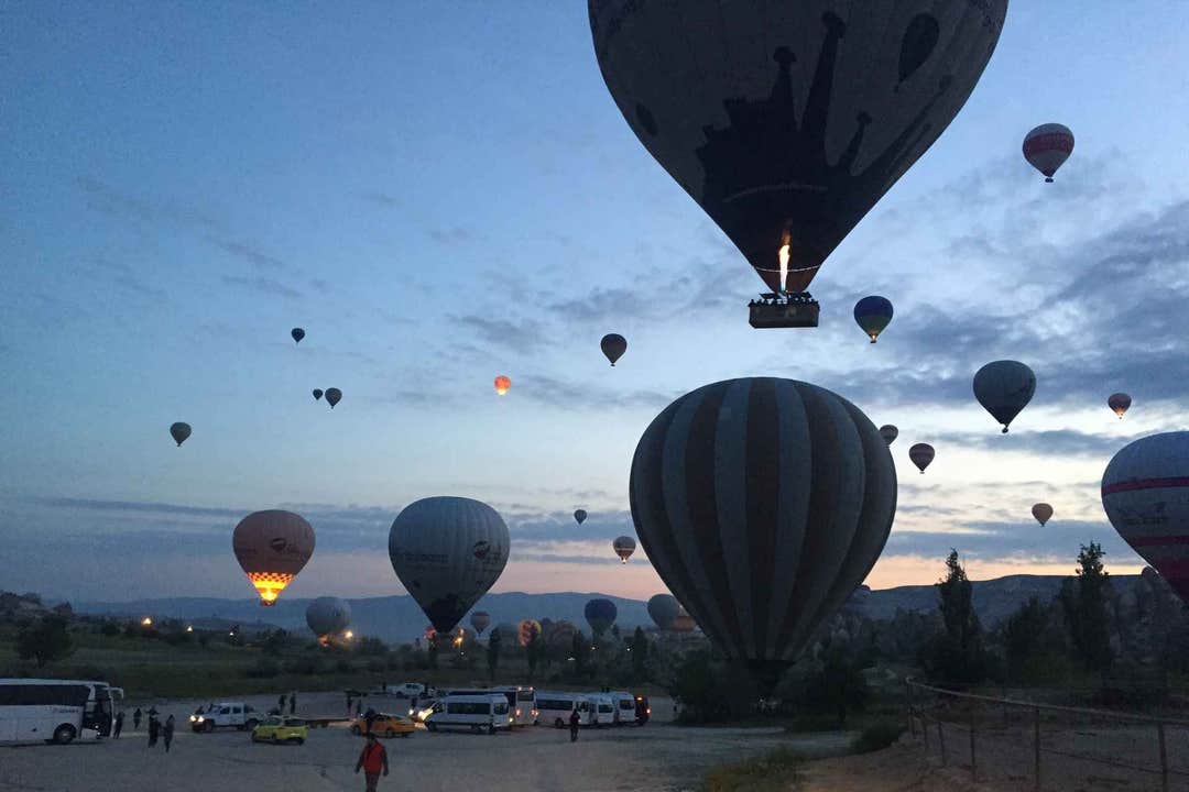 Experimenta la impresionante vista de los globos aerostáticos flotando con gracia sobre los encantadores valles de Capadocia. Comienza tu día temprano con una recogida a las 5:30 AM desde tu hotel en Avanos y dirígete al sitio de lanzamiento para ver la preparación e inflado de los vibrantes globos.