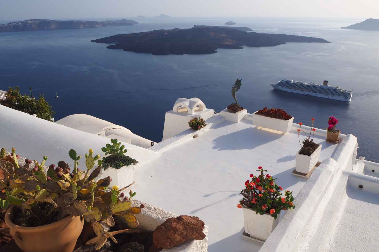 Une fois à Athinios Port, un bus confortable vous transportera jusqu'à Fira, la capitale animée de Santorin. Profitez de votre temps libre pour explorer les lieux : prenez le téléphérique, visitez le plus grand marché d'or de Grèce sur la rue Ypapantis, ou dégustez un repas dans un café local.