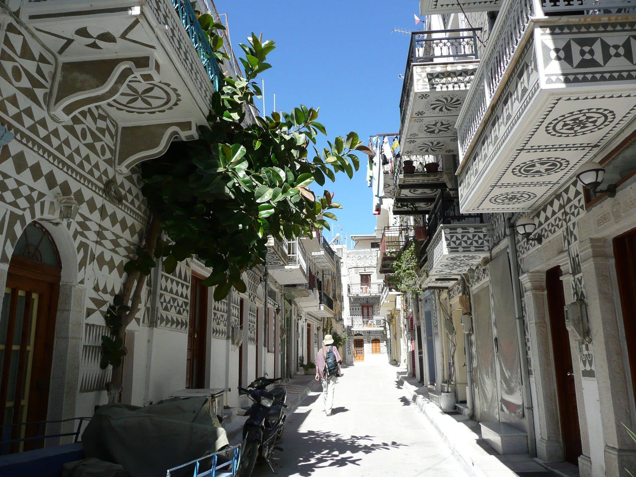 What sets Pyrgi apart is its distinctive architecture. The village is renowned for its 'xysta'—geometric decorations that adorn the façades of its buildings. These intricate designs are created by scraping away layers of plaster to reveal contrasting colors beneath, forming stunning black and white patterns.