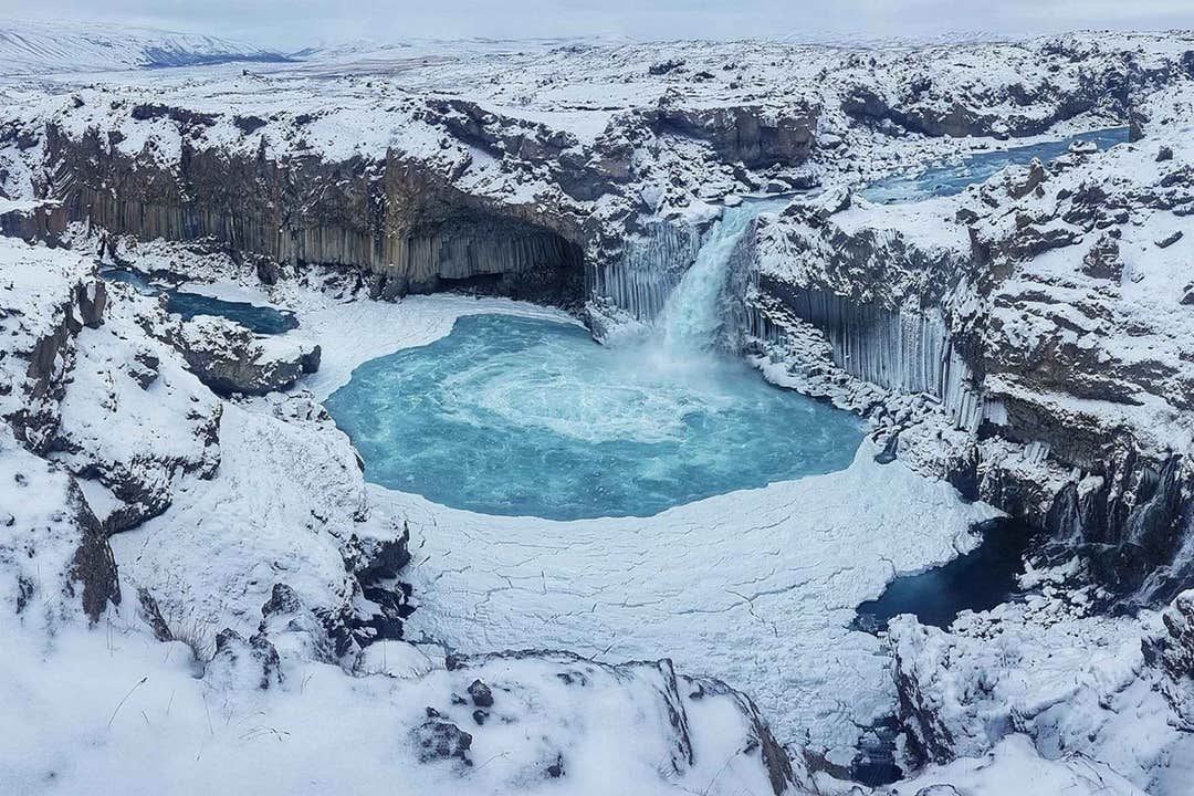 Next, explore the lesser-known Hrafnabjargafoss. In winter, it transforms into a stunning natural wonder, with water cascading over cliffs into a rock bowl, surrounded by mesmerizing icy formations.