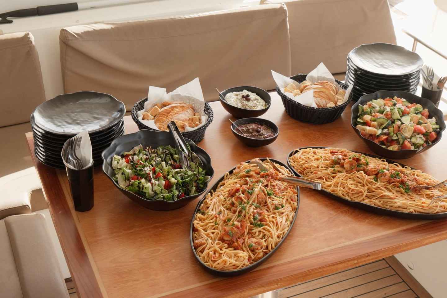 地元のドリンクやフルーツでリフレッシュした後は、ギリシャサラダや前菜、シュリンプ・リングイネなど地中海料理のランチをご用意。ベジタリアンメニューもあり、ワインやビール、ソフトドリンクとともにお召し上がりいただけます。