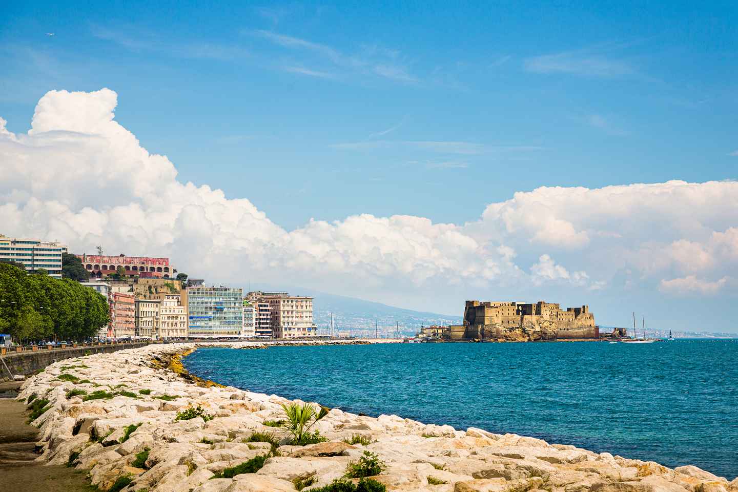 冒険の始まりは、壮大なヴェスヴィオ山を背景にしたナポリの遊歩道から。象徴的なカステル・デッローヴォや、魅力的なカフェやショップが並ぶボルゴ・マリナリを通り過ぎます。
