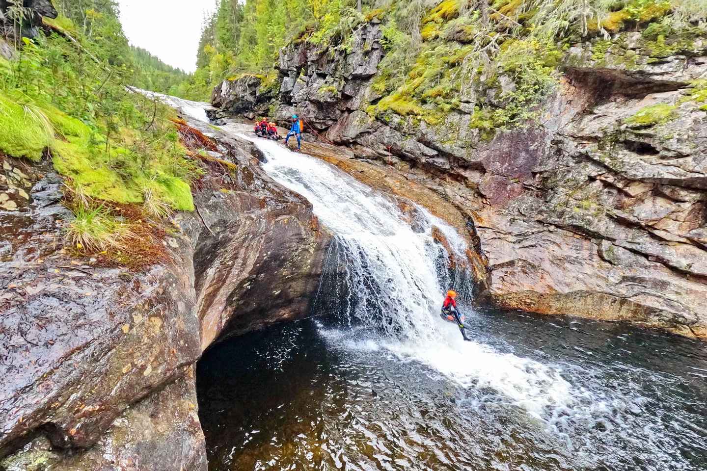 最初に、安全説明を受け、ヘルメット、ウェットスーツ、ハーネスなど必要な装備を身につけます。短いシャトルライドでキャニオンに到着すると、1,500メートルのセクションと180メートルの難所が待ち受けています。