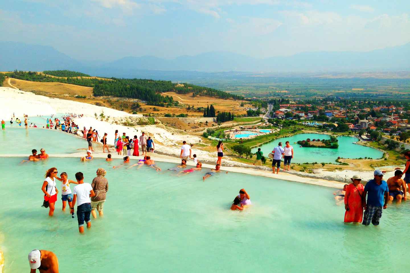 パムッカレは訪れるべき必見の場所であり、石灰棚、透き通った水のプール、そして温泉を探検します。世界の8番目の驚異と称されるこの自然の奇跡は、毎年数百万の訪問者を魅了しています。