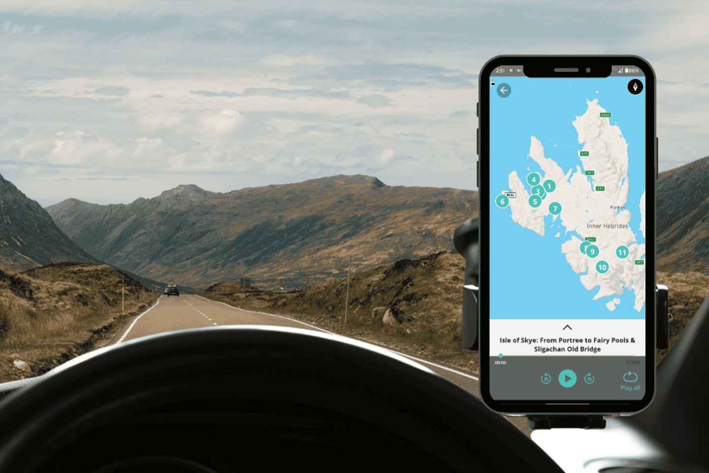 스카이섬의 숨막히는 아름다움을 스마트폰 오디오 가이드를 통해 경험해 보세요! 모험은 8세기 동안 맥클라우드 가문의 역사적인 고향인 던베건 성과 정원에서 시작됩니다.