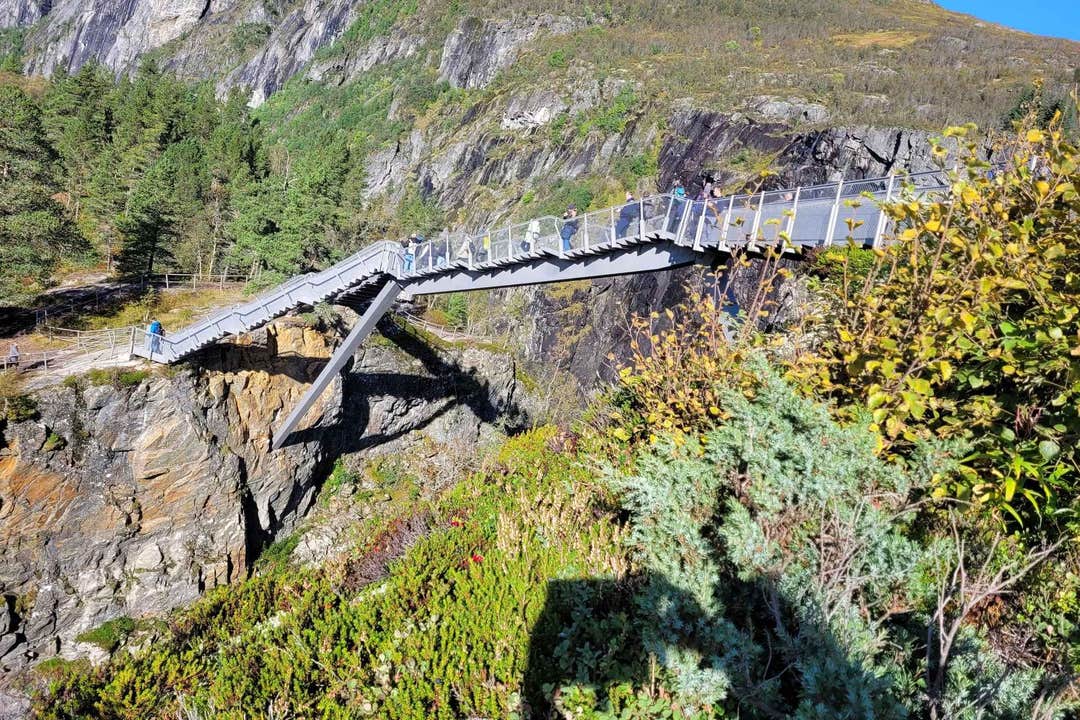 Relax as you travel through scenic landscapes on a comfortable shuttle, arriving at the top of the mountain where you can enjoy panoramic views of Vøringsfossen. From the safe viewing platforms and the newly constructed step bridge, marvel as torrents of water cascade into the stunning Måbødalen valley below.