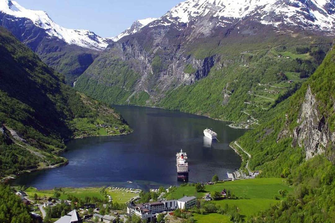 In Hellesylt, board a ferry across the stunning fjord to Geiranger. During the journey, enjoy panoramic views of dramatic cliffs and cascading waterfalls, while the onboard audio guide shares fascinating insights about the region. Lunch and snacks are available for purchase onboard, making your journey comfortable and informative.