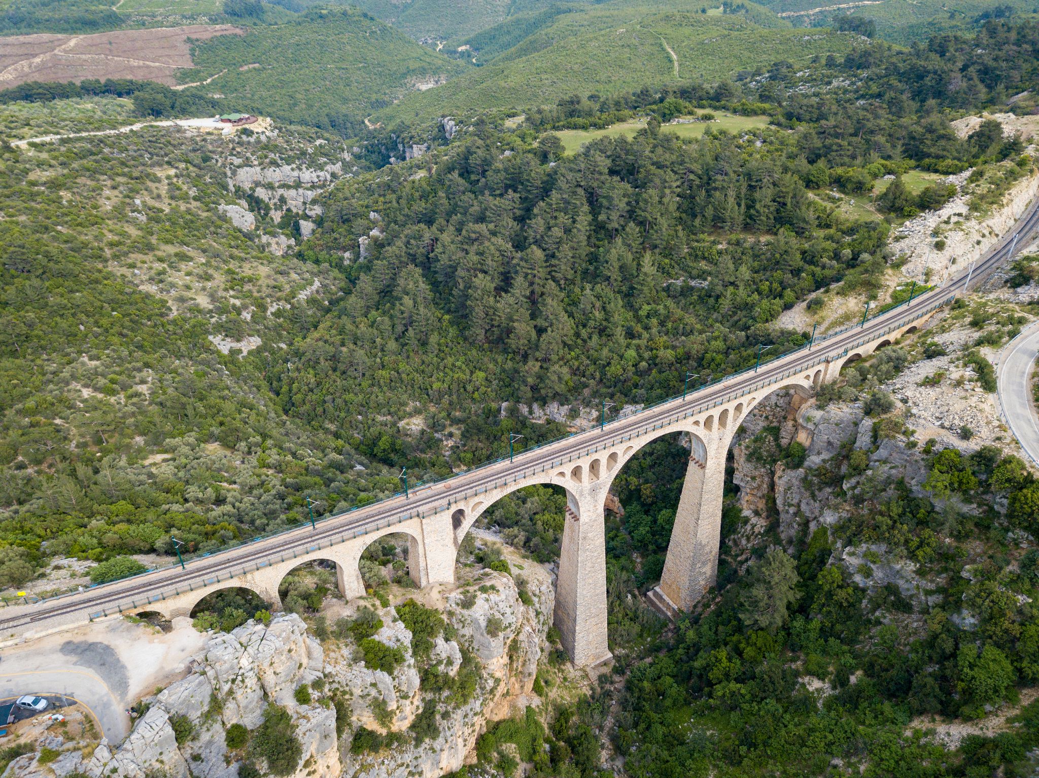 The Varda Viaduct, located in the picturesque countryside of Kıralan, Turkey, is a marvel of engineering that captures both the imagination and the eye. One of its most striking features is its sheer height and span. Towering at an impressive 98 meters (321 feet) above the canyon floor, it provides breathtaking views of the surrounding landscape.