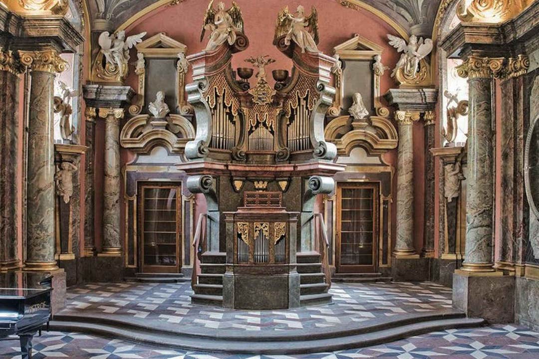 镜厅的内部装饰精美,充满了大理石、镜子和壁画,只有通过音乐会和导览才能进入。这座建于1722至1726年的巴洛克瑰宝,为音乐爱好者营造了一个充满魅力的氛围。